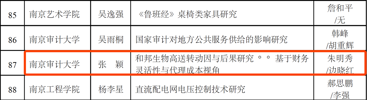 近日,江苏省学位委员会、江苏省教育厅公布了2019年江苏省优秀博士硕士学位论文评选结果,云顶国际8588yd2016级会计专业硕士研究生张颖(指导老师:朱明秀)的论文《和邦生物高送转动因与后果研究——基于财务灵活性与代理成本视角》被评为2019年江苏省优秀专业学位硕士论文。这是公司举办MPAcc项目以来第二次获此殊荣。