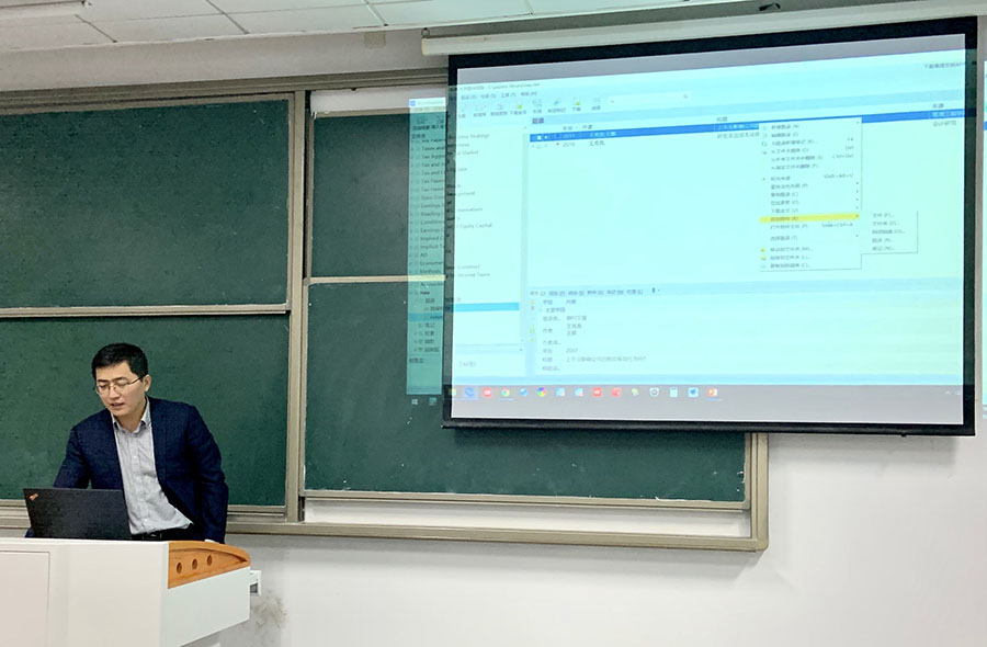 首先,王老师回顾了上节课NoteExpress软件如何将知网与百度学术中参考文献引用与导入的使用方法。其次,王老师从数据收集、Stata介绍、Stata数据整理、Stata统计描述/推断四个维度来讲述实证研究从01的跨越:以国泰安数据库与万德数据库导出的上市母公司报表与合并报表的数据为例,讲述如何在Stata软件中导入数据、处理数据、用命令进行数据的描述性统计、相关分析、回归分析等,为同学们搭建了实证分析最基础最夯实的框架。最后,王老师展示了实证论文写作“八股”范式,以及在论文写作过程中如何巧妙地运用NoteExpress将引用的参考文献“一键”插入,给予同学们在论文写作、实证研究路上更多探索的空间与遐想。