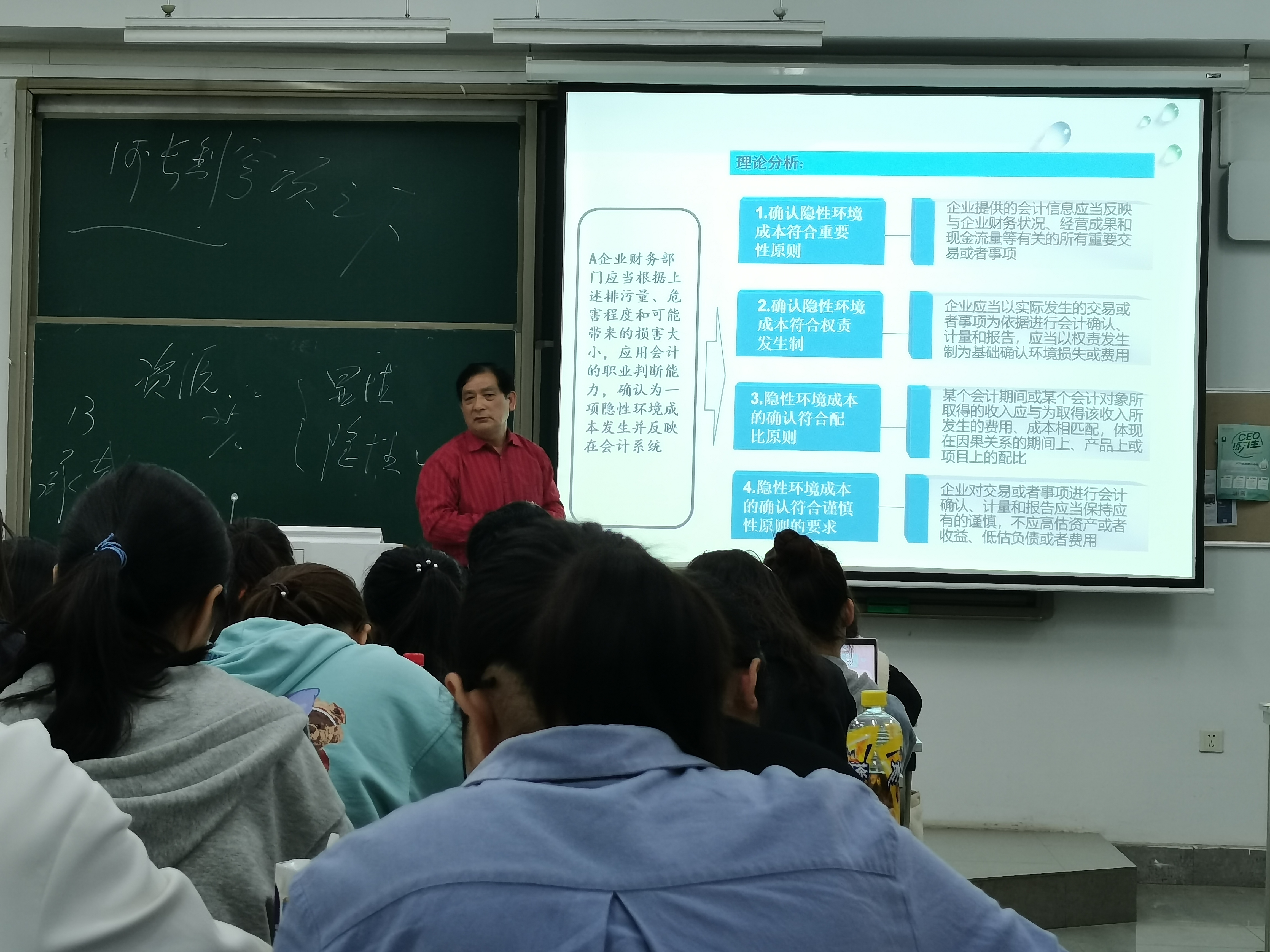 讲座开始,袁广达教授以环境污染的照片为切入点引入本次话题,从生态文明与资源环境会计的关系等四个方面进行讲述。袁广达教授提出会计可与其他学科进行交叉并认为环境会计产生的社会和理论基础是新时代环境思想和企业价值观,并提出了企业文化等九大识别影响环境责任履约的因素。袁教授认为,在我国现行会计制度尚未建立与环境费用配套的会计核算体系,仅在企业“管理费用”会计科目中设置了“排污费”和“绿化费”项目,所以应注意在原企业会计科目的基础上,增设与会计有关的会计科目,如环境资产、环境成本、环境负债以及反映企业对环境、自然资源和人类的损害及赔偿的会计科目,反映企业在改善生态环境和自然资源以及安全生产所提取的社会效益。最后袁广达教授还分享了自己对于如何确认隐形环境成本的理解,这给予了在座师生很多启发。