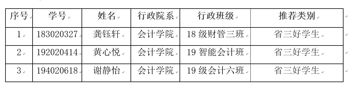 根据学校《关于推选省级三好员工、优秀员工干部、优秀毕业生和先进班集体的通知》要求,经员工申报、学院审核讨论,拟推荐龚钰轩、黄心悦、谢静怡3位同学为2022年江苏省三好员工候选人,现予以公示。