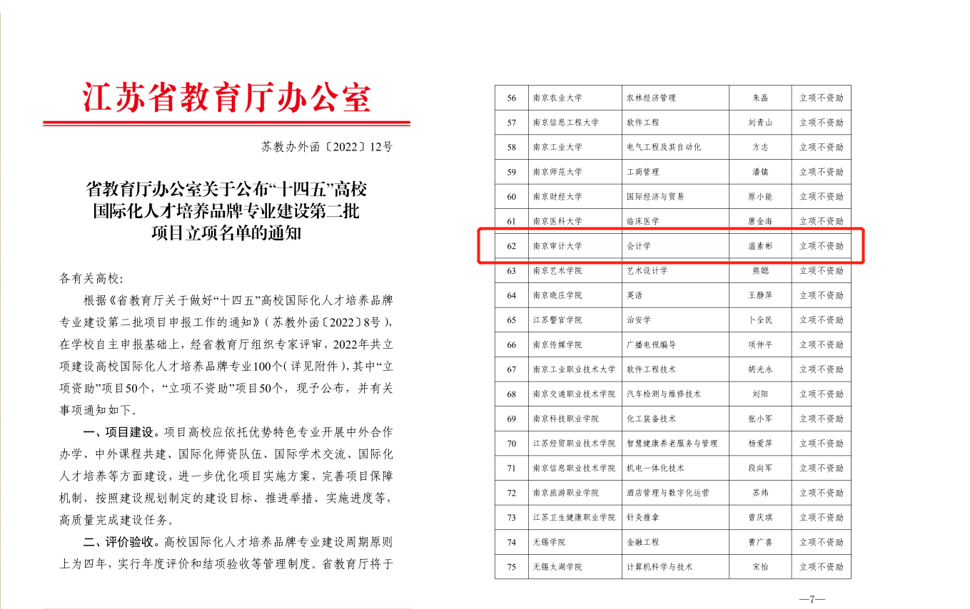 近日,江苏省教育厅公布了《“十四五”高校国际化人才培养品牌专业建设第二批项目立项名单》(苏教办外函〔2022〕12号),公司会计学本科专业成功入选。