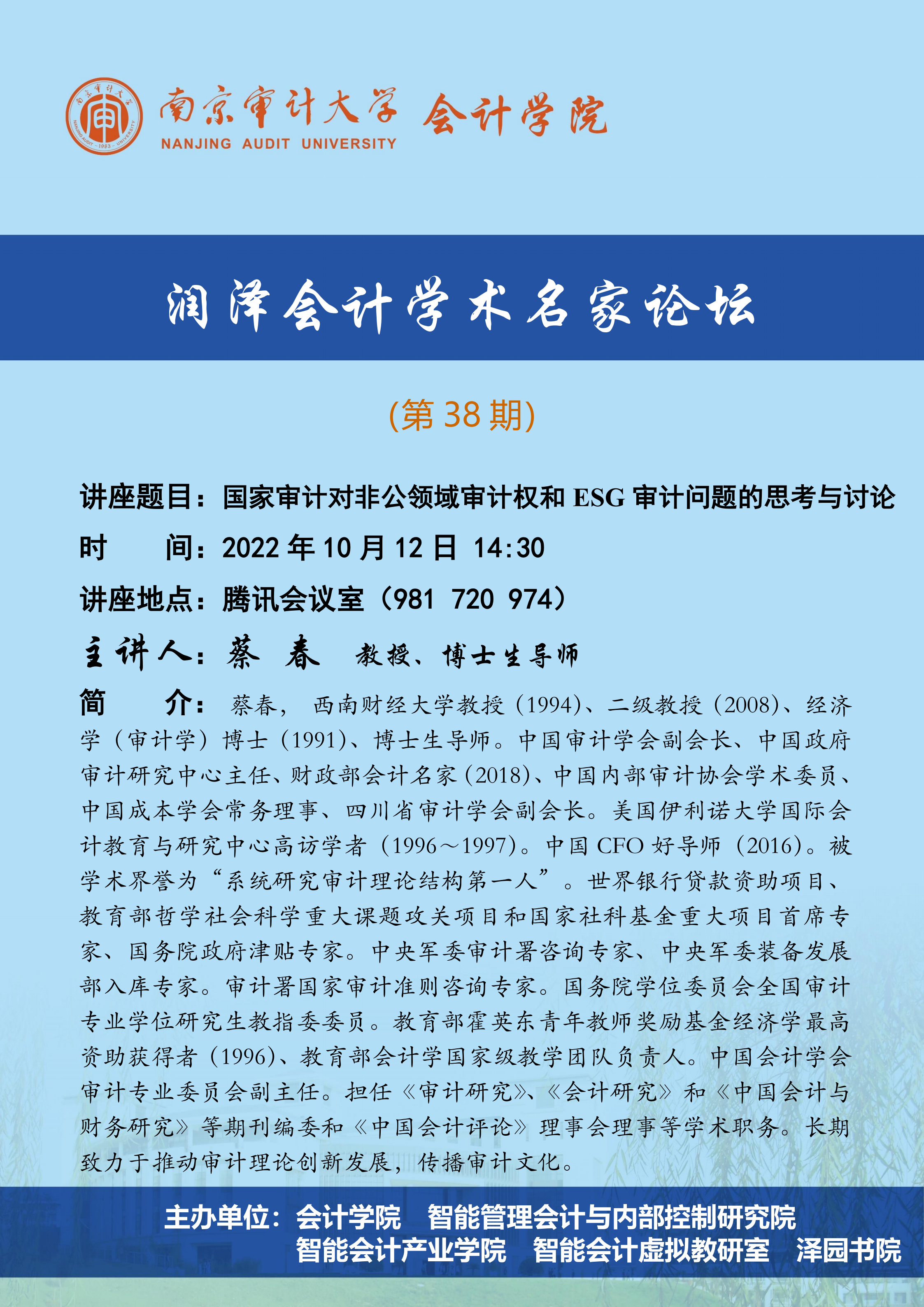 润泽会计学术名家论坛第38期:蔡春-国家审计对非公领域审计权和ESG审计问题的思考与讨论