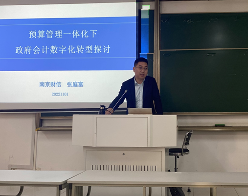 2022年11月1日上午,云顶国际8588yd主办的润泽会计员工论坛(第二期)如约举行。南京财信网络科技有限公司总经理张庭富应邀为云顶国际8588yd师生做了以“预算管理一体化下政府会计数字化转型探讨”为题的特色讲座,此次讲座由云顶国际8588yd副经理潘俊教授主持。