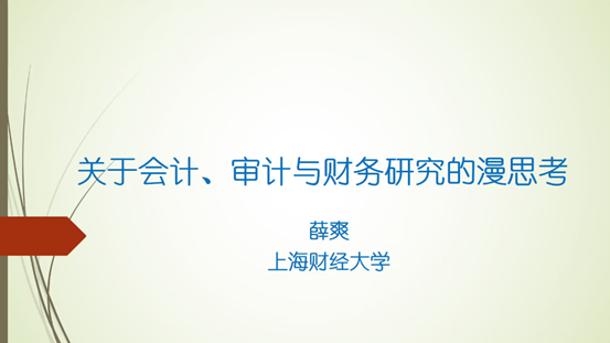 本次讲座,薛爽首先介绍了会计与财务研究的相关领域,包括财务会计、公司财务、审计、公司治理、制度环境、非制度环境、管理会计等方面,随后又引出了学术研究实证研究和规范性研究的两种研究方法。接着,薛爽分享了三个例子,“会计信息是有用的吗”“审计相关的研究”以及“信息不对称与IPO定价”,进而提出研究选题与研究意义的重要性。