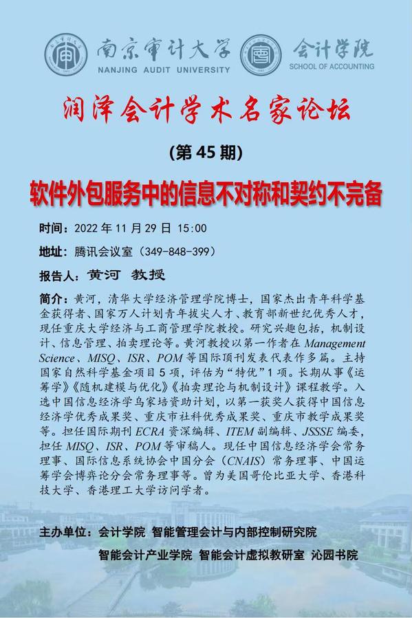 润泽会计学术名家论坛第45期:黄河-软件外包服务中的信息不对称和契约不完备