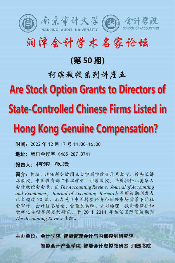 润泽会计学术名家论坛第50期:柯滨——Are Stock OptionGrants to Directors of State-Controlled Chinese Firms Listed in Hong Kong Genuine Compensation?
