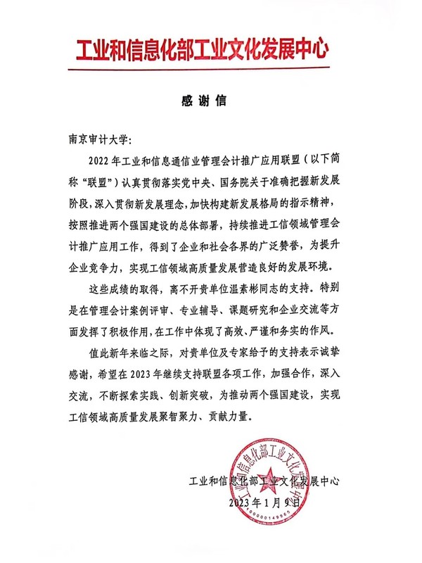 近日,工业和信息化部工业文化发展中心代表工信部向公司发来感谢信,对公司温素彬教授在积极配合工信部开展管理会计案例评审、专业辅导、课题研究和企业交流等方面的积极表现提出表扬,希望在新的一年里继续在管理会计领域不断加强合作、深入交流,发挥公司学科优势,不断探索实践、创新突破,为推动两个强国建设,实现工信领域高质量发展聚智聚力、贡献力量。这是工信部连续第3年向公司发来感谢信。