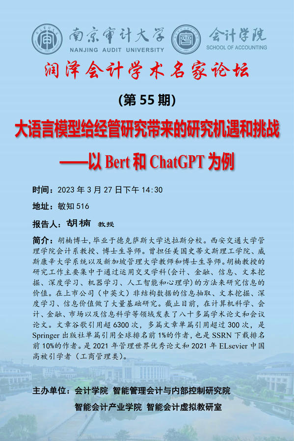 润泽会计学术名家论坛第55期:胡楠——大语言模型给经管研究带来的研究机遇和挑战---以Bert和ChatGPT为例