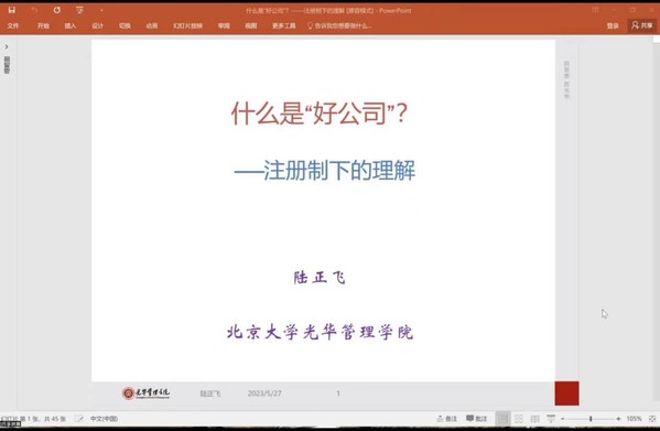 北京大学陆正飞教授作“什么是‘好公司’——注册制下的理解”的主题报告,他首先从包容发行条件视角,明确监管层面好公司的条件,介绍投资者分析师如何结合信息披露内容理解公司的好坏,接着提出尽管注册制下环境包容更加多元,利润质量仍然是判断公司好坏的不可或缺的重要条件,最后结合利润预测中需要考虑的重要因素阐述对“好公司”的理解,运用多个案例,如9号机器人IPO、科大讯飞、银行系保险公司、亚马逊、百度等,清晰生动地阐明了“好公司”的判断条件标准。