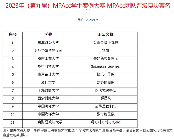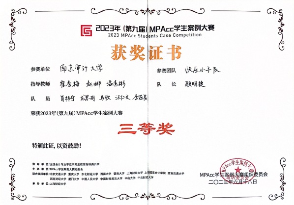618日,2023年全国第九届MPAcc员工案例大赛在上海财经大学成功举办。由崔秀梅、赵娜和温素彬三位老师指导、2022级会计专硕研究生顾明捷、肖祎宁、龙思玥、马欣、汪仁文、李冠男组成的“快乐小子队”凭借优异表现,经过初赛第一阶段、第二阶段,冲进全国前3‰,经过复赛、决赛,荣获全国三等奖,献礼校庆四十华载。