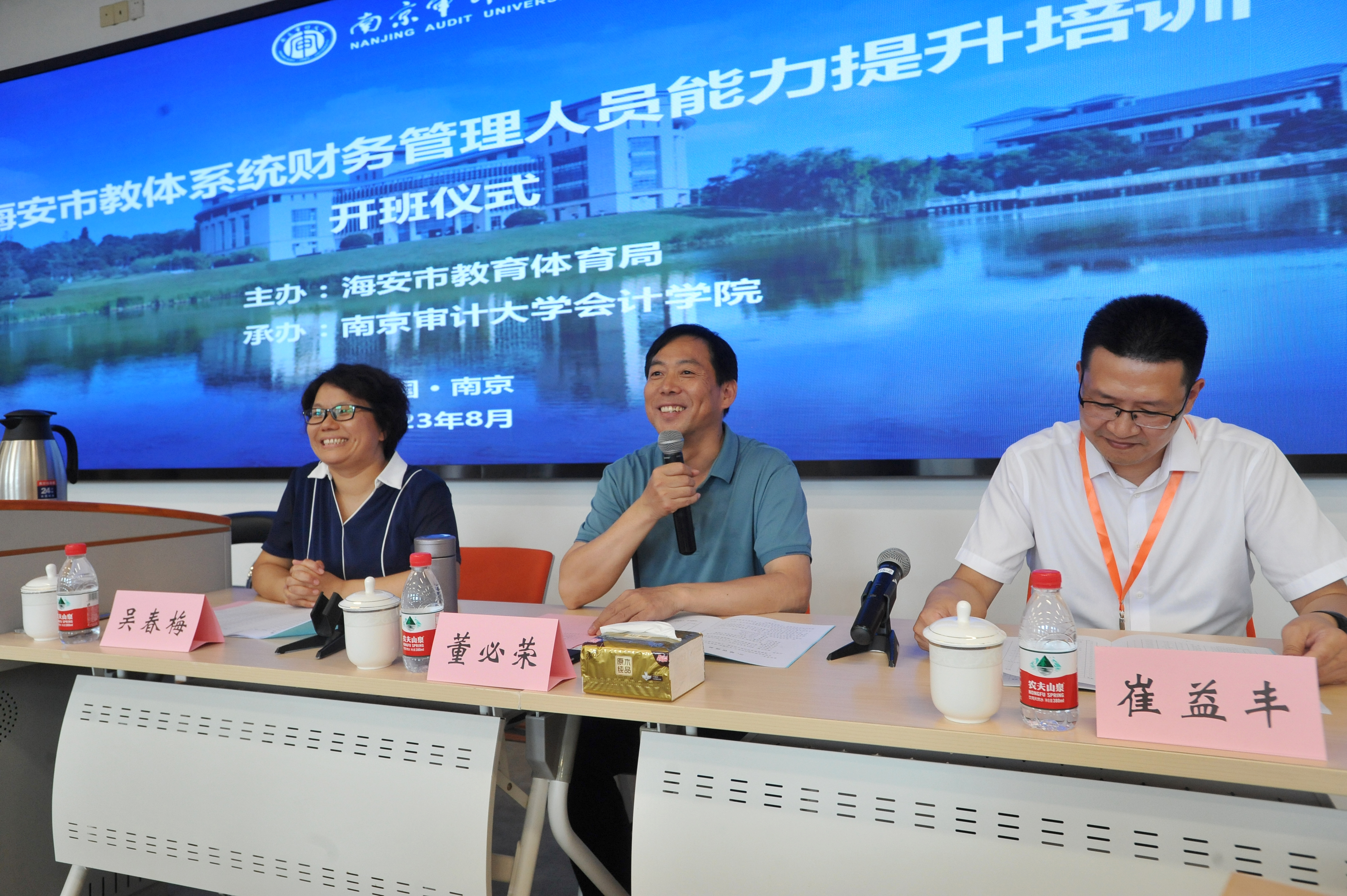 公司党委副书记、董事长董必荣参加开班仪式并致辞。董必荣对海安教体局的信任和支持表示感谢,他指出,在深入学习贯彻习近平总书记重要回信精神的过程中,审大人充满信心、干劲十足,正在奋力推进高水平一流大学建设,他向参训学员介绍了学校40年来的办学成果和基于审计特色的发展战略。董必荣结合新时代中小学财务管理的发展趋势,受邀做《中国式现代化与教育强国建设》主题教育党课。