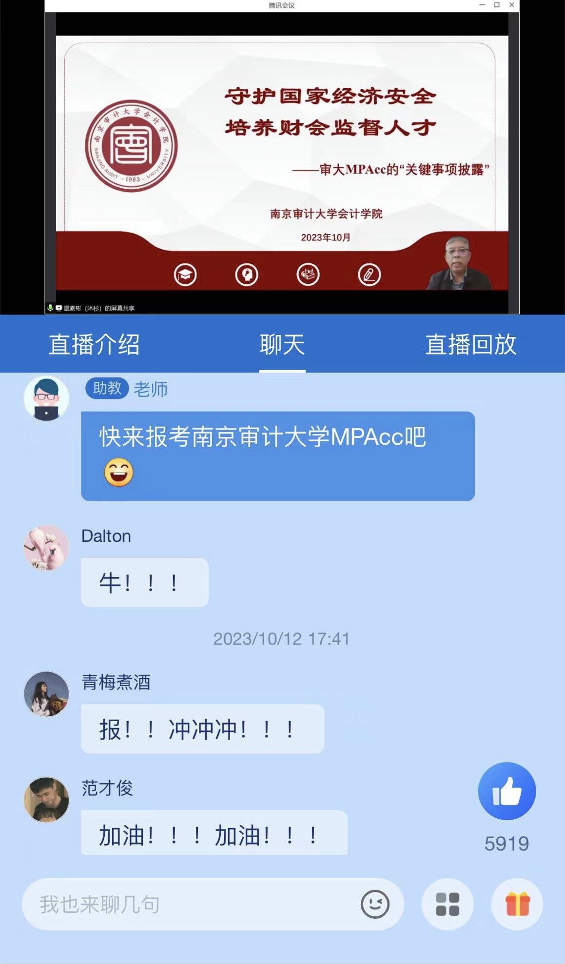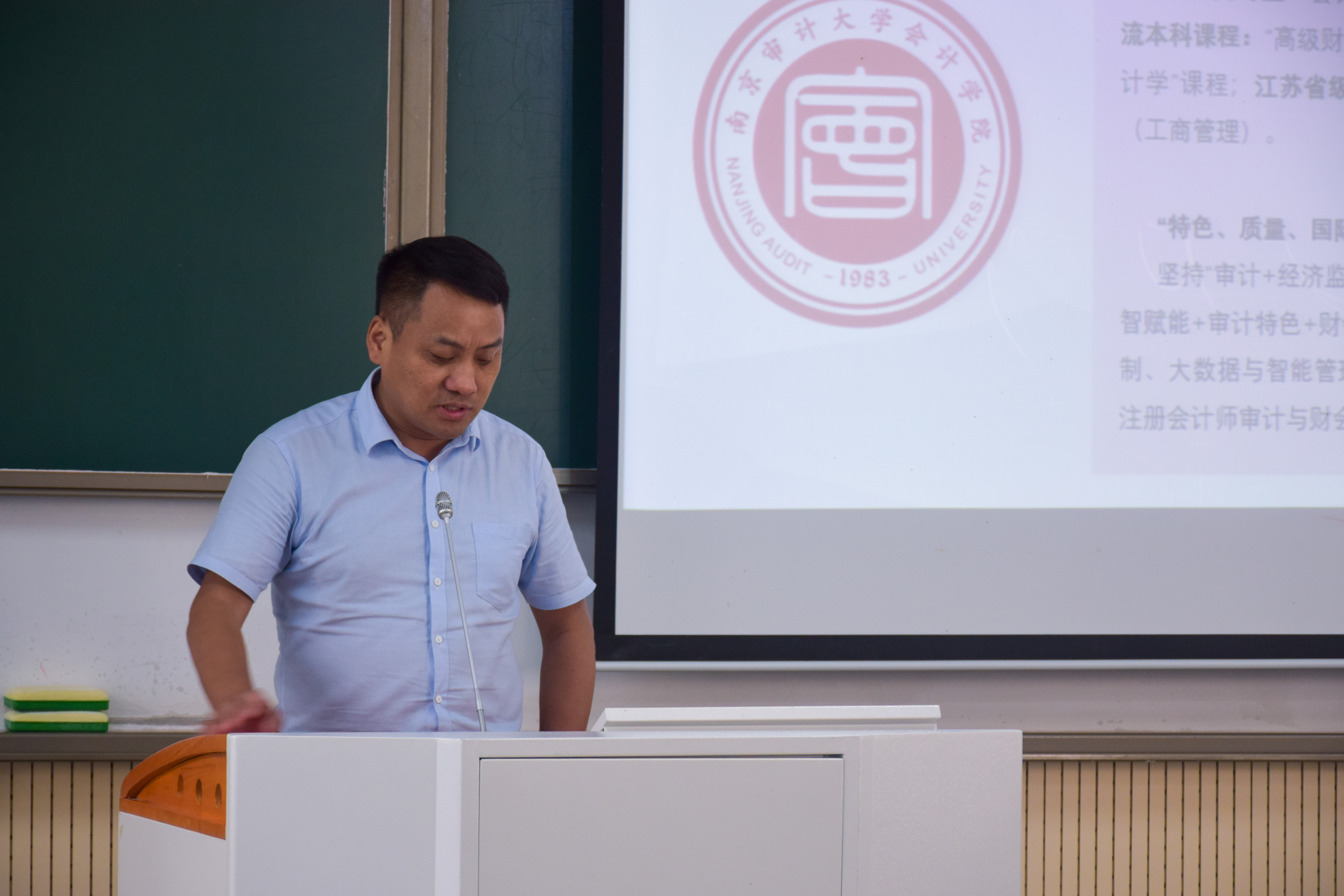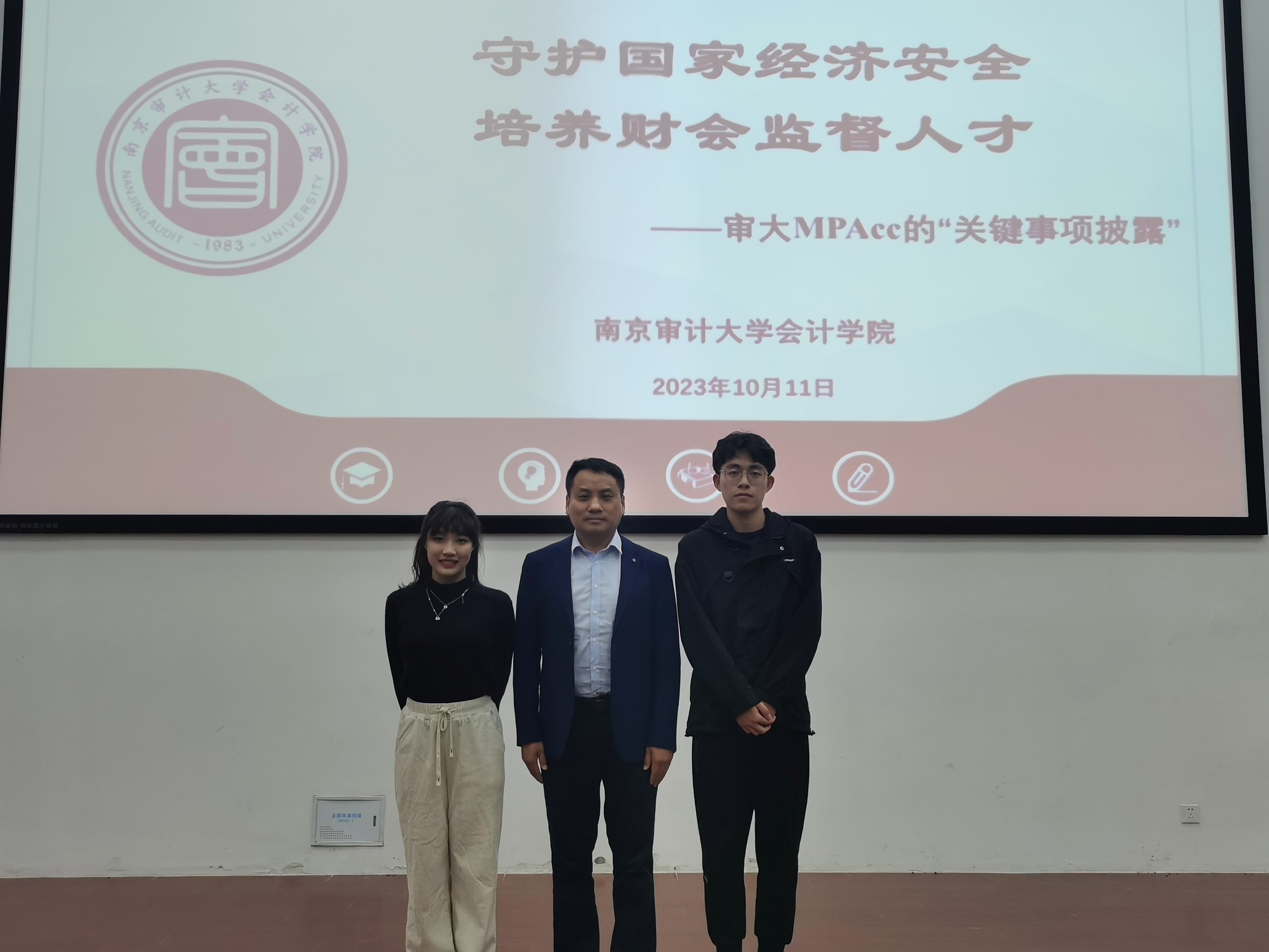 2023年10月11日,云顶国际8588yd赴云顶国际8588yd金审学院召开MPAcc招生宣讲会。公司党委副书记兼副经理潘俊、研究生代表蒋卓珺和李晓平同学前往参加。潘俊通过“守护国家经济安全,培养财会监督人才”主题宣讲,对云顶国际8588yd近年来在专业建设和学科方面建设的成就进行了介绍,并指出,学院始终坚持“审计+经济监督+国家治理”的学科总体布局,突出“财会本色、审计底色、智能亮色、行业特色”,在诸多领域形成了特色培养方向;对学院MPAcc项目进行介绍,指出该项目注重培养和提升员工的系统思维、团队协作能力、创新意识和创新能力,并介绍了南审MPAcc考研相关政策;最后,鼓励同学们结合自身未来就业规划,积极报考!