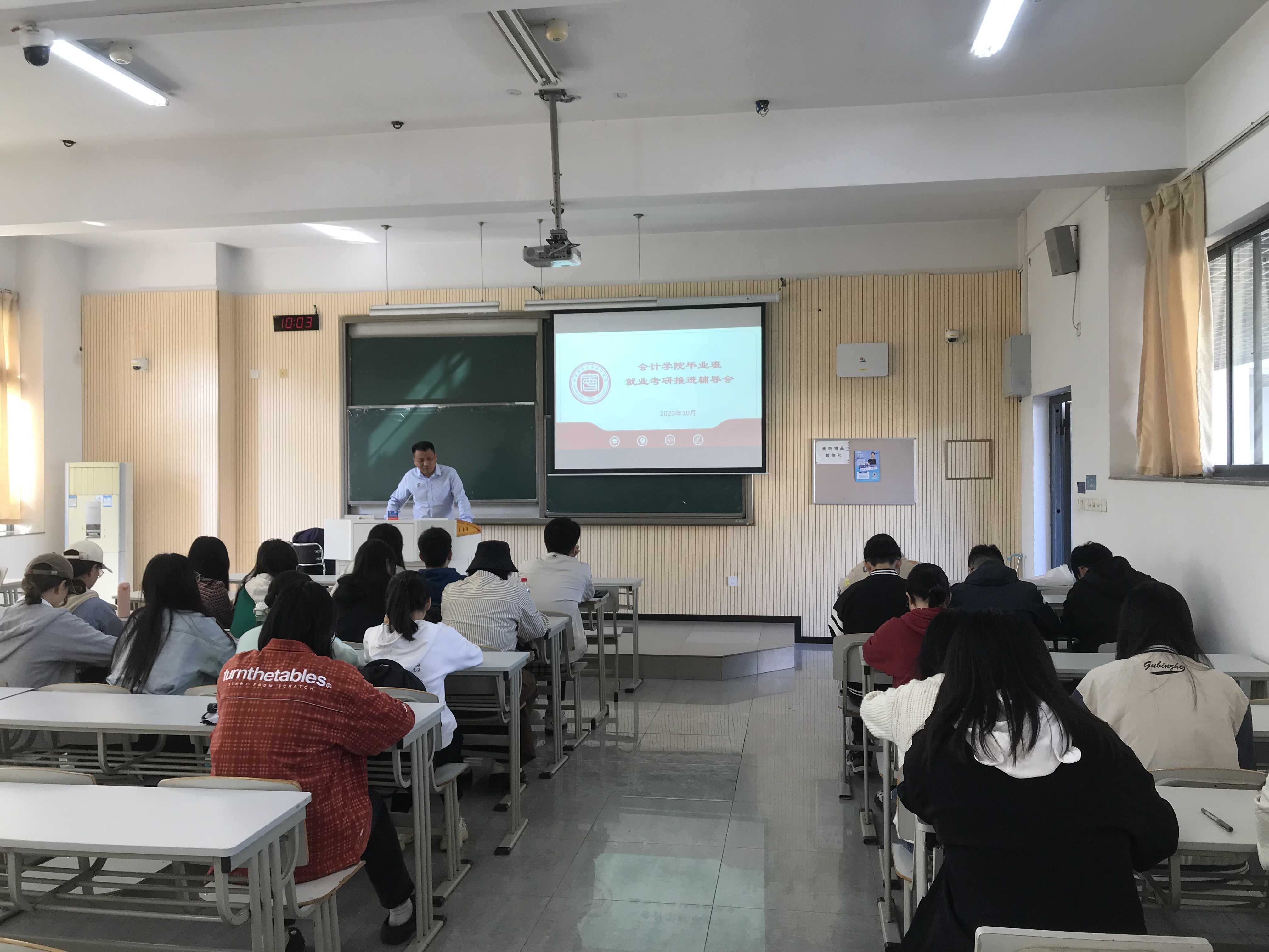 温素彬从考研、就业等方面进行全面分析。首先,他指出考研可以帮助提升思维方式和专业技能,更有助于拓宽学科视野和社会关系,并详细介绍了学院服务考研学子实施的多项举措;详细解读了硕士研究生招考政策,并结合公司历届员工升学情况,分别从学院概况、人才培养、学位点特色、政策保障等方面进行一一介绍,鼓励同学们充分结合自身实际,积极报考公司MPAcc;其次,鼓励同学们树立“先就业再择业”的正确理念,立足职业生涯规划,摆正心态,充分把握升学与就业机会。