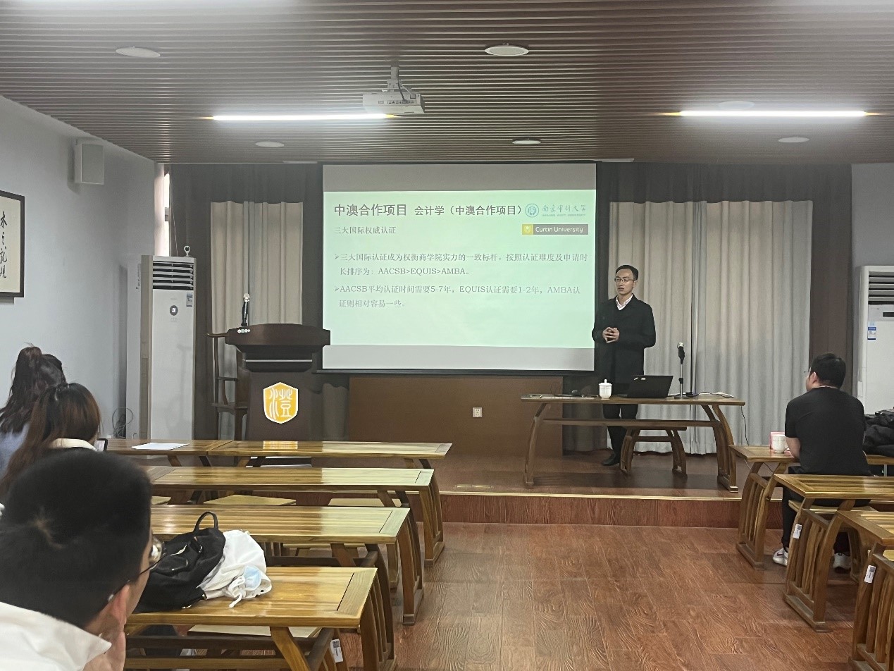 周达勇回顾了中澳合作项目的办学历程和取得的丰硕成果,中澳合作项目是公司第一个中外合作办学项目,也是公司第一个经教育部批准的与国外高水平大学联合培养会计学专业本科教育项目,是公司“特色、质量、国际化”教学理念的重要实践。同学们此前对科廷大学了解不多,周达勇向同学们展示了科廷大学在世界大学排名中的位置、优势学科、专业特色等情况。此外,对于科廷大学商学院取得的AACSB、EQUIS、EFMD三大认证,周达勇还结合国内高校获得这些认证的情况,直观体现了科廷大学的实力和优势。周达勇还向同学们介绍了中澳合作项目在申请澳大利亚名校研究生时的优势,比如获得科廷大学商学学士学位后悉尼大学、新南威尔士大学等名校将豁免英语能力要求,专业成绩要求也低于非项目员工。通过对比分析,让同学们了解中澳合作项目的优势与价值。