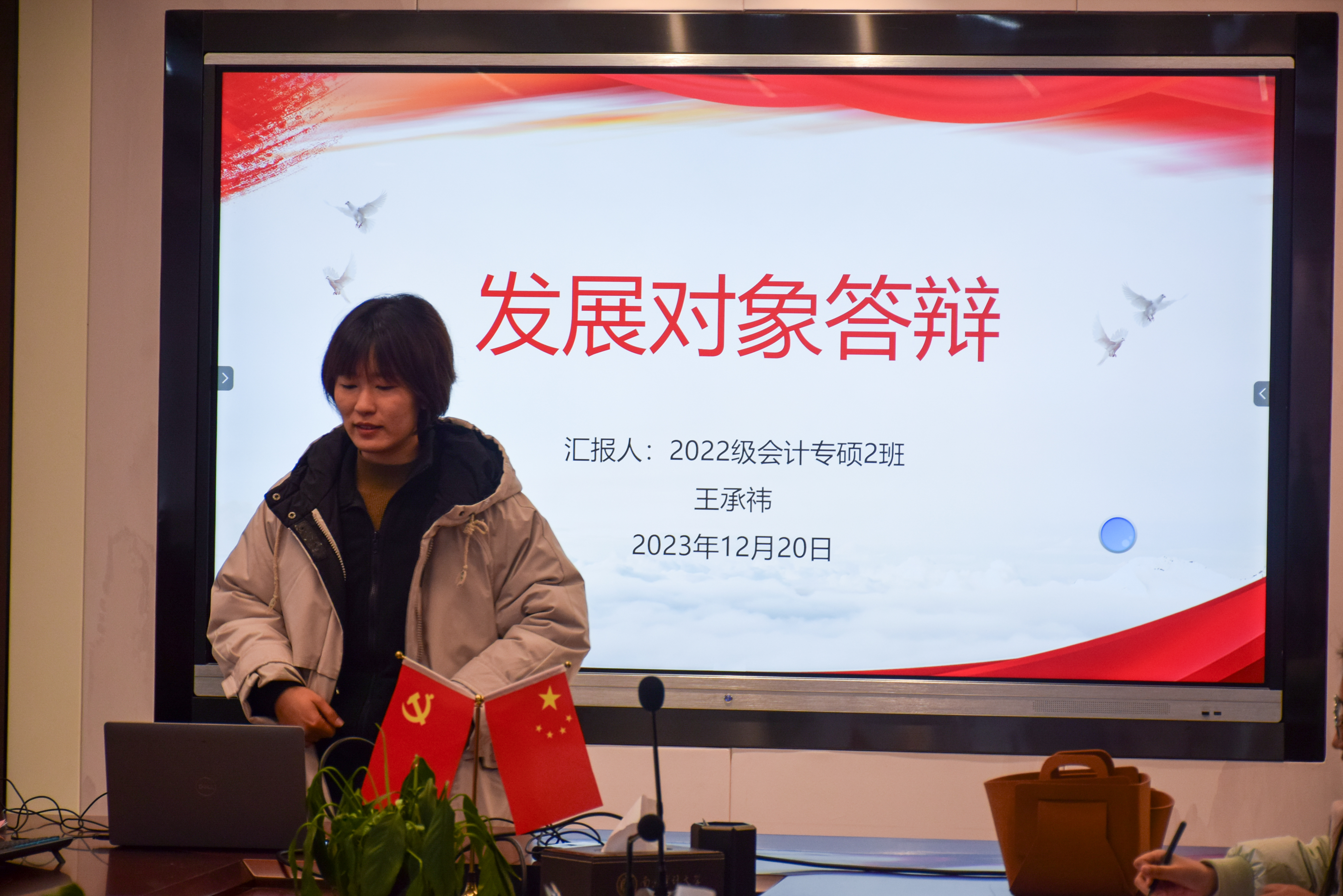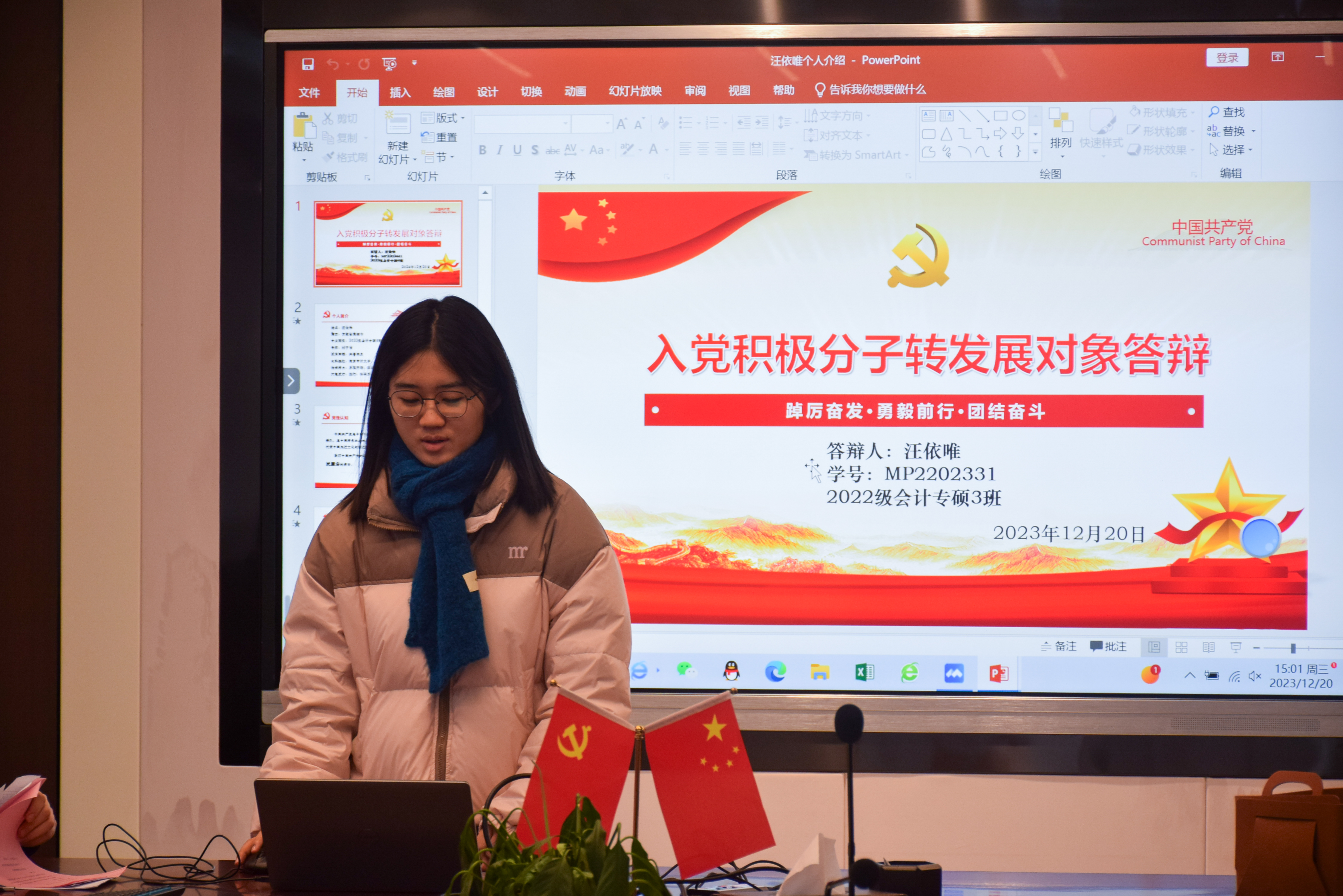 2022级会计专硕2班的王承祎同学将人生价值的实现与对党的认识相结合,围绕“入党为什么”、“入党干什么”以及“如何发挥带头作用”三个主题进行阐述。她表示:“从‘入党为什么’来看,党的宗旨就在于全心全意为人民服务,入党意味着责任与使命,意味着奋斗与奉献;就‘入党干什么’而言,要勇于奉献、甘于奉献、乐于奉献,把有限的生命投入到无限的为人民服务中去,为建设更加美好的社会贡献自己的力量,从而实现自我人生价值、让生命熠熠闪光;在专业学习和科学研究方面,要更加注重学术素养和科研精神的提升,努力在学术研究上取得成果;同时,要积极参与集体活动,在集体中发挥自己的作用,带动他人一起进步,以实际行动和成绩展现模范带头作用。”