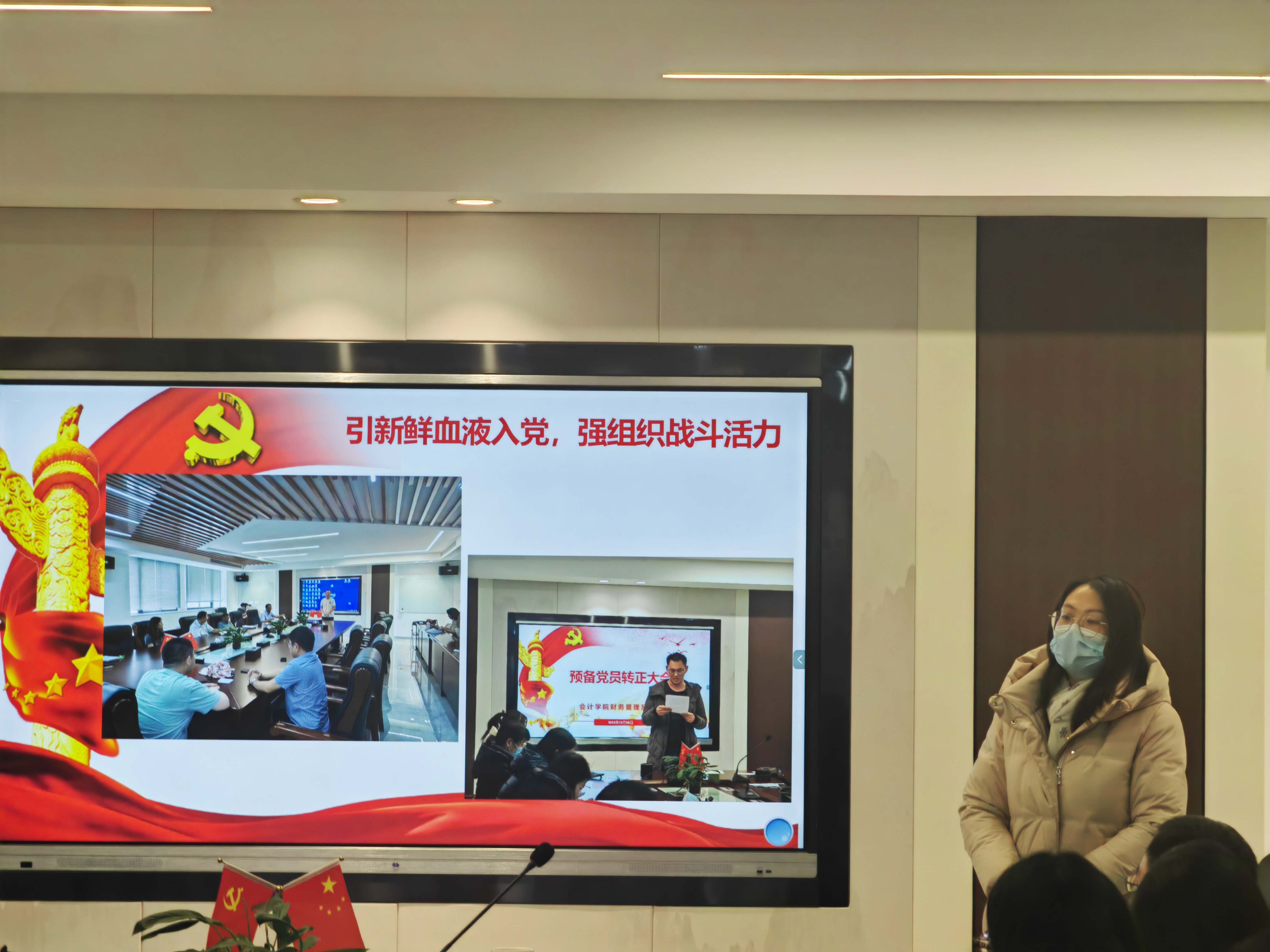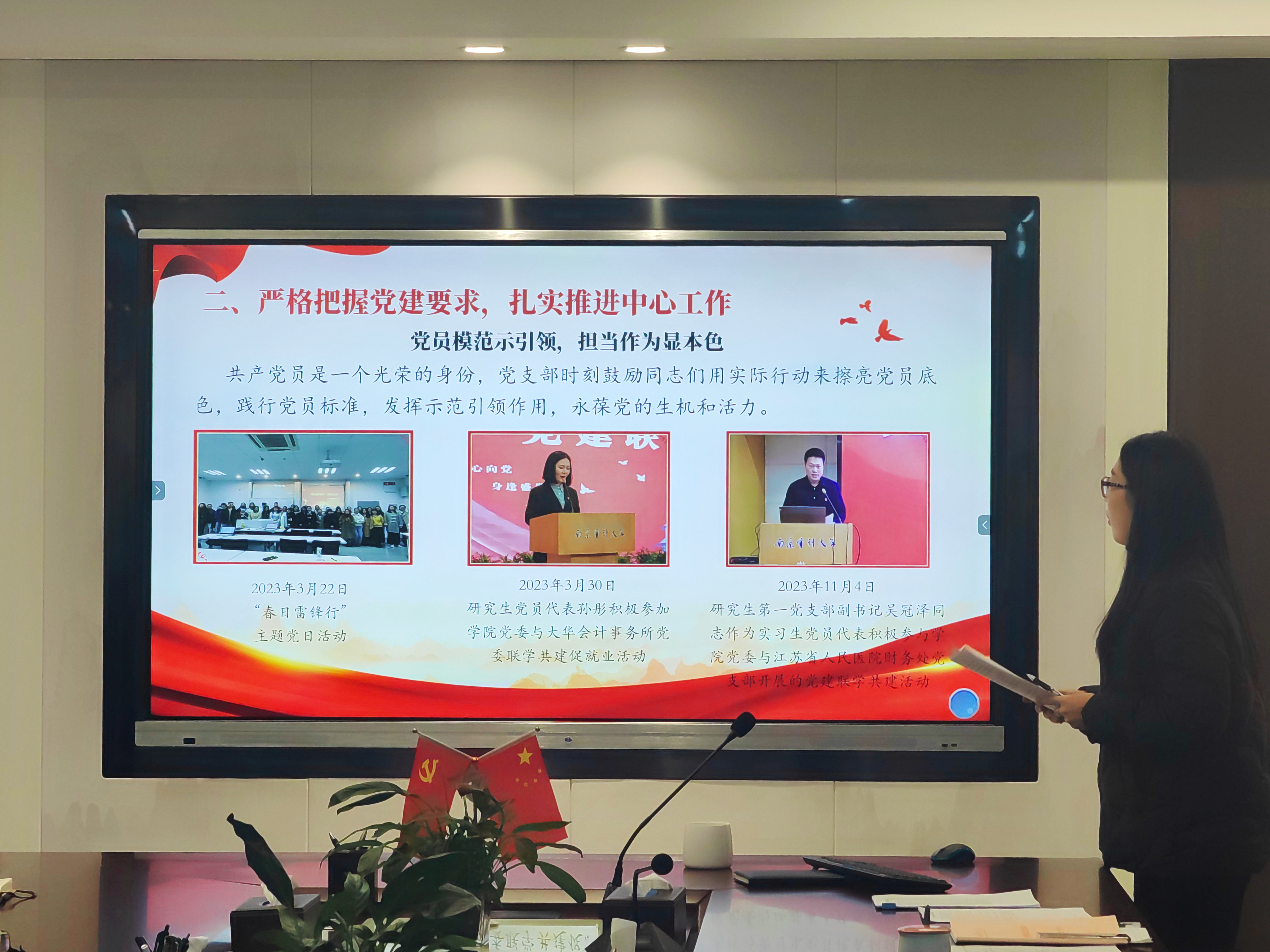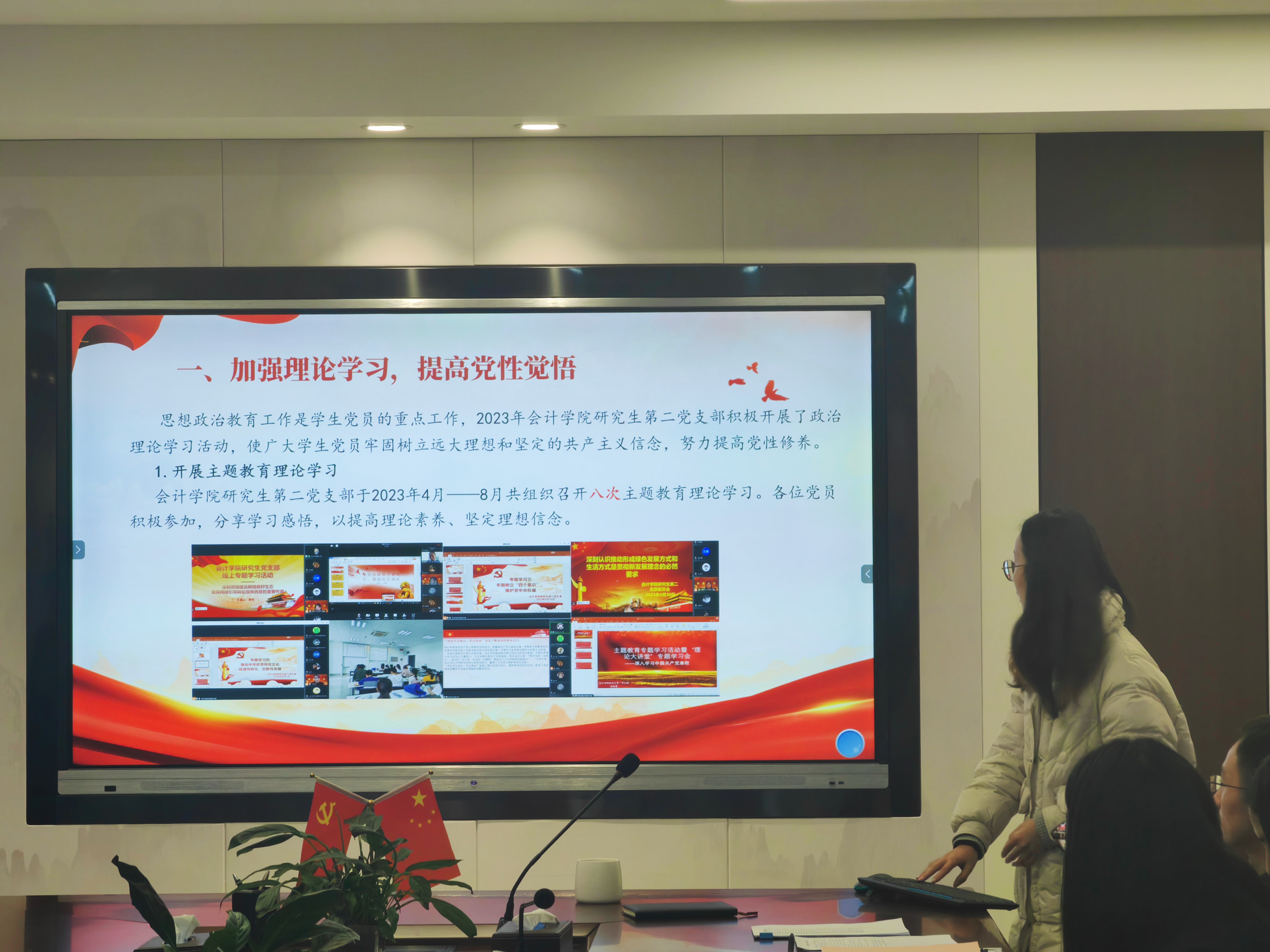 研究生第二党支部书记李潇琦重点从加强理论学习、党员培养、活动实施以及组织建设四个方面对2023年党建工作进行汇报,展现研究生党员的青春风采。