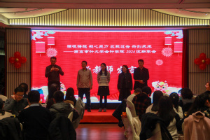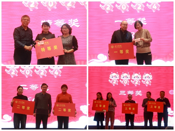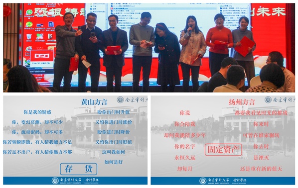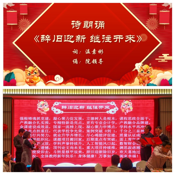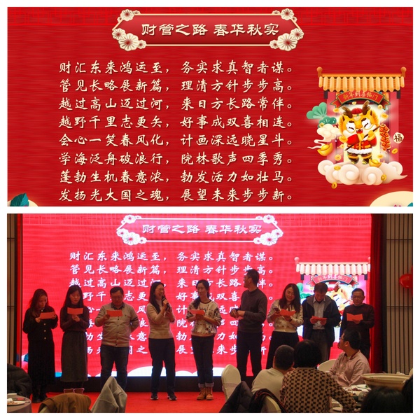 老师们用诗意的语言,抒发对学校、学院和对教育事业的热爱。由经理温素彬原创,领导班子集体朗诵《辞旧迎新 继往开来》,回顾2023年成果,展望2024年工作,祝福全体老师新年快乐、身体健康、万事如意、阖家幸福;财务管理系带来藏头诗《财务管理 春华秋实》——“财务管理越来越好,云顶国际8588yd蓬勃发展”,老师们用家乡方言,表达对学院的美好祝福;会计系带来《会计诗朗诵猜谜》,8位来自苏皖鲁鄂的老师用家乡方言朗诵会计诗词,台下老师竞猜谜底是哪个会计科目,现场热烈欢快的氛围让大家感受到会计学科的知识性和趣味性。