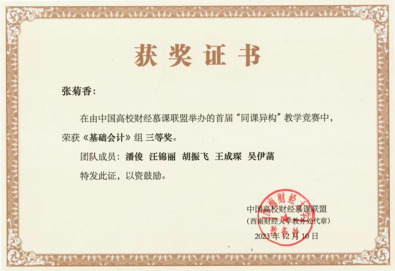 2023年10月21日至22日,首届中国高校财经慕课联盟《基础会计》“同课异构”课程思政教学竞赛在东北财经大学成功举办。来自中央财经大学、上海财经大学、中南财经政法大学等全国33所知名财经院校的“基础会计”课程骨干教师展开了激烈的角逐,公司张菊香老师(团队)荣获三等奖。