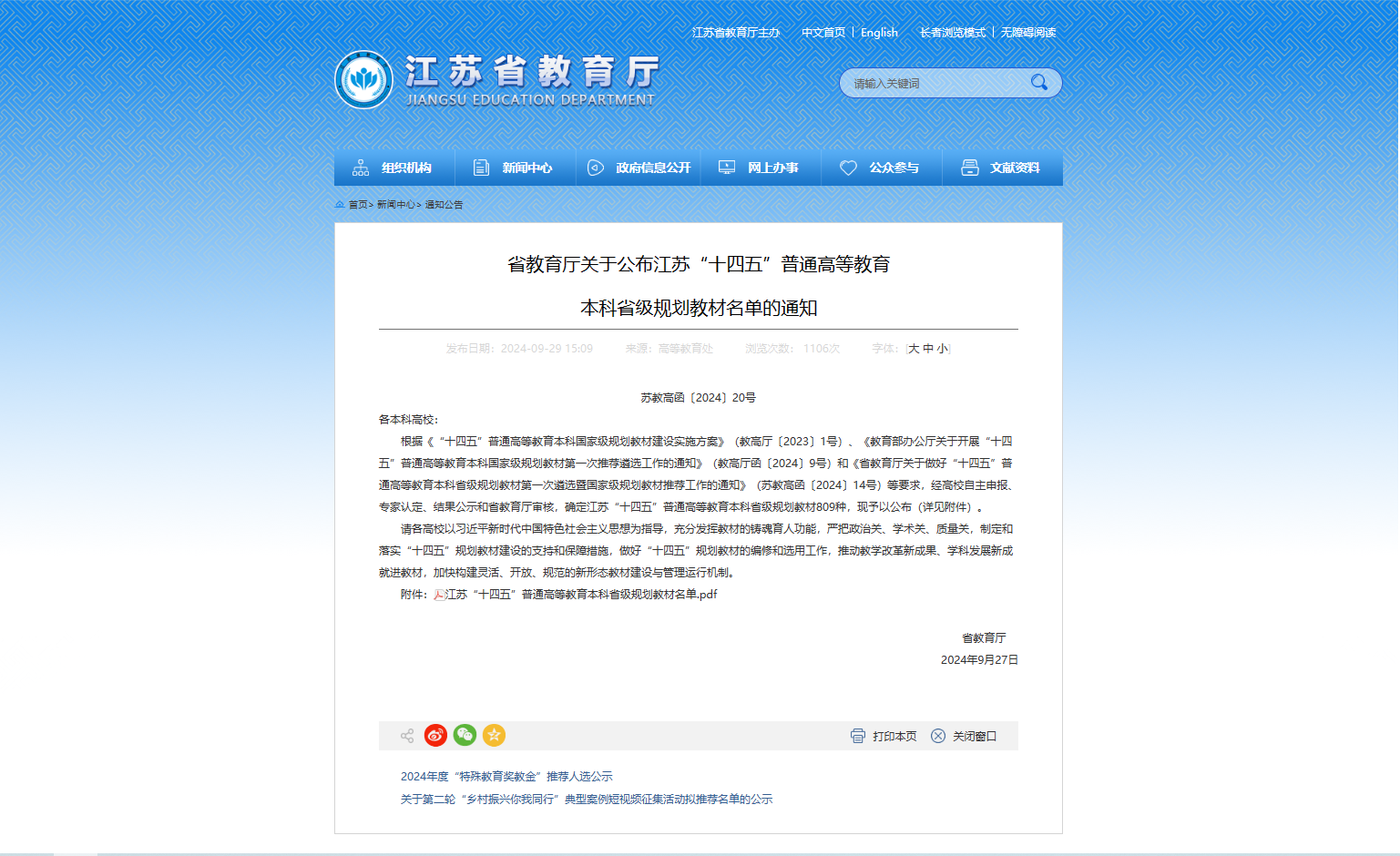 近日,江苏省教育厅发布《省教育厅关于公布江苏“十四五”普通高等教育本科省级规划教材名单的通知》(苏教高函[2024]20号),审定江苏“十四五”普通高等教育本科省级规划教材809部。云顶国际8588yd4部教材获批江苏“十四五”普通高等教育本科省级规划教材,全校共有10部教材获批。