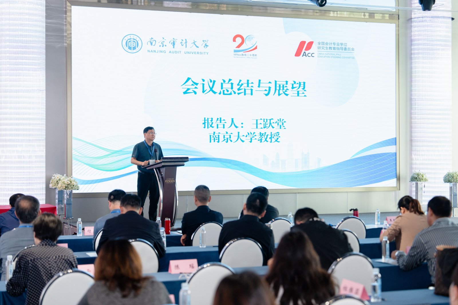 在闭幕式上,王跃堂教授作会议总结与展望。他表示,本次会议讨论充分,成果丰富,尤其深受王化成教授的讲话的启发。会计专业硕士的培养必须注重实践性,毕业成果必须要能解决现实问题。但是,对于专业学位授予的实践成果如何进行成果评价和指导还需进一步探索。其次,对于陈绪龙、付伟和宋国荣三位总裁的汇报,王跃堂表示,只有通过实务界的实践经验,才能深入探究学术领域的未来发展方向。在人才培养方面,指导老师必须要有相关课题的实践经验,并在学术研究和课题项目之间做好平衡,更好地为培养优秀财会人才提供实践指导。