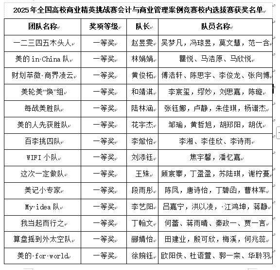根据云顶国际8588yd发布《云顶国际8588yd2025年全国高校商业精英挑战赛会计与商业管理案例竞赛》通知,经各团队申报、学院评审、现场答辩等环节,本次竞赛共评选出一等奖团队19个、二等奖团队21个、三等奖团队26个,优胜奖团队41个。现将获奖名单公示如下。
