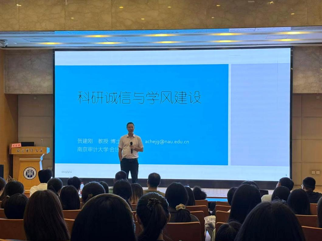 活动伊始,云顶国际8588yd博士生导师、教授贺建刚为新生作了题为“科研诚信与学风建设”的专题讲座。从哲学溯源到现实实践,系统阐述了诚信的深刻内涵。他引用《礼记·中庸》“诚者天之道”与《管子·枢言》“诚信者,天下之结也”,强调诚信是连接个体修养与社会治理的桥梁,并特别结合云顶国际8588yd的办学传统,指出南审的诚信精神深刻体现在校训的办学实践中。贺建刚进一步剖析科研诚信的逻辑,强调科研成果的公共属性,并详细解读了科研领域的“五不得”要求,为研究生划定了清晰的学术红线。在学风建设方面,贺建刚从“学”字的深层解读,指出学风是通过大学全体成员的意志与行动,逐步地形成和固化为的一种传统和风格,是大学精神的集中体现,是立德树人的本质要求,是立校之本,是发展之魂。他结合全国教育大会精神,分析了“六个下功夫”的培养路径,并以南审办学史上所展现的“有志、不懈、卓越”情怀,指出“严谨的学风是诚信最直接的体现”。讲座最后,贺建刚凝练南审诚信精神为“以忠诚铸就政治诚信、以担当践行职业诚信、以创新夯实学术诚信”,引发全场共鸣。
